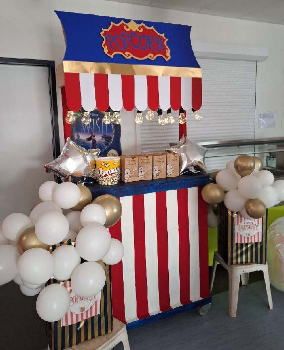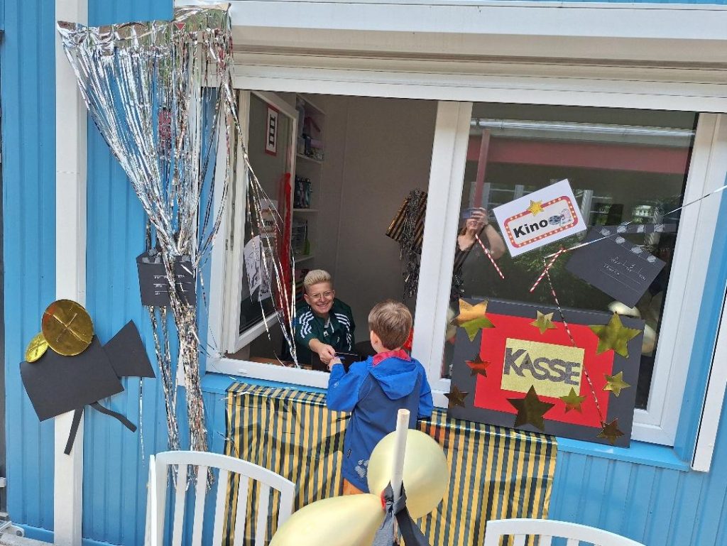 Die Mensa wurde liebevoll in einen Kinosaal umgestaltet. Es wurden verschiedene Stände aufgebaut, an denen die Kinder kleine Leckereien und Getränke bekommen konnten. Besonders beliebt waren die Popcorn- und Wassereis-Stationen. Für die kleinen Gäste gab es außerdem eine kleine „Kasse“, an der sie ihre Wertmarken gegen die gewünschten Snacks eintauschen konnten.